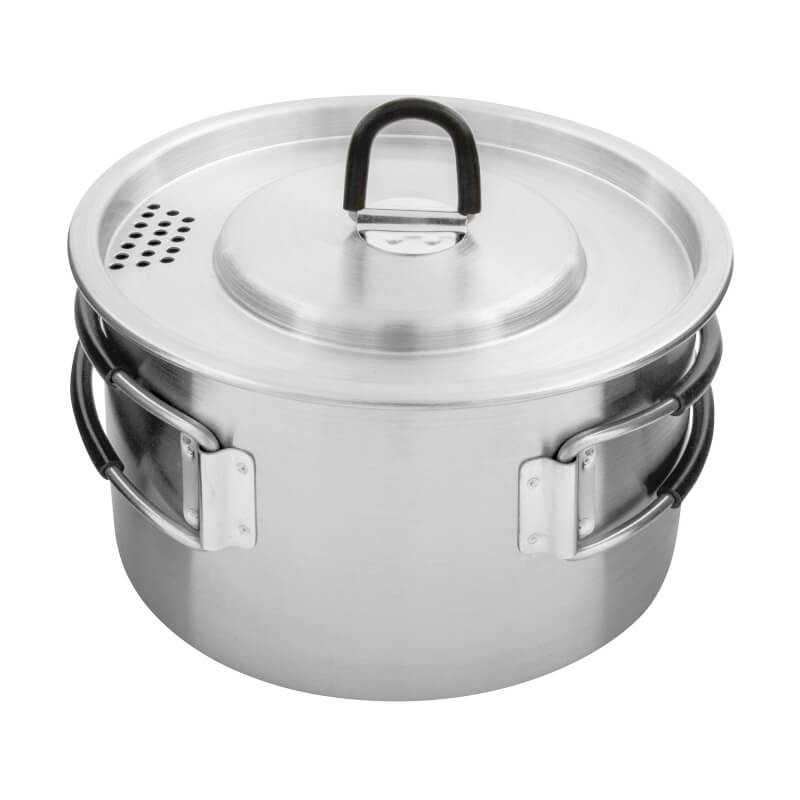 Pokrywka tego garnka ma otwory, dzięki którym można łatwo odsączyć wodę z gotowania. Bardzo praktyczna jest również miarka objętości wewnątrz, dzięki której można dokładnie przestrzegać instrukcji przygotowania potraw na świeżym powietrzu.