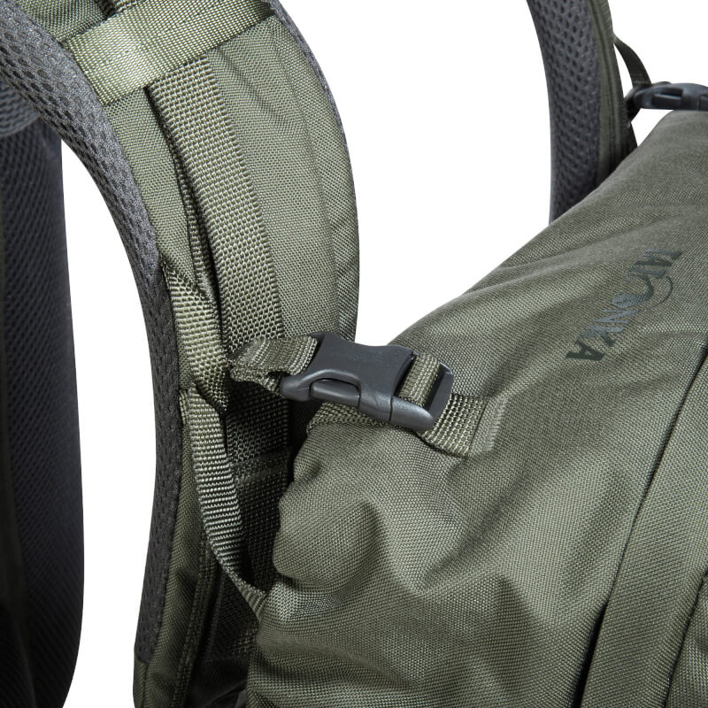 Pokrywę plecaka można zdjąć i przymocować do szelek jako przednią kieszeń – lub używać osobno jako torby na ramię. Plecak zawiera również miejsce na system nawadniający oraz oliwkową osłonę przeciwdeszczową.